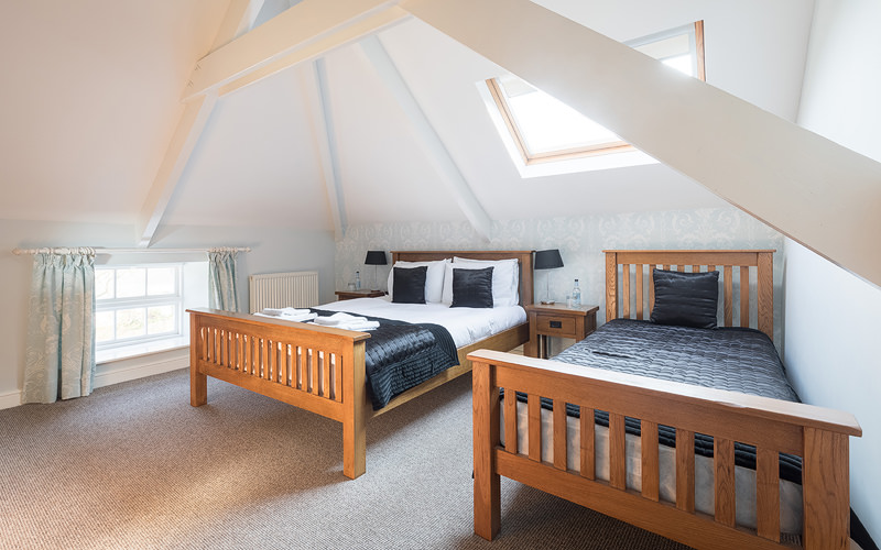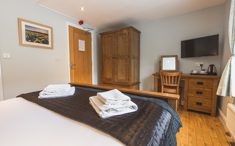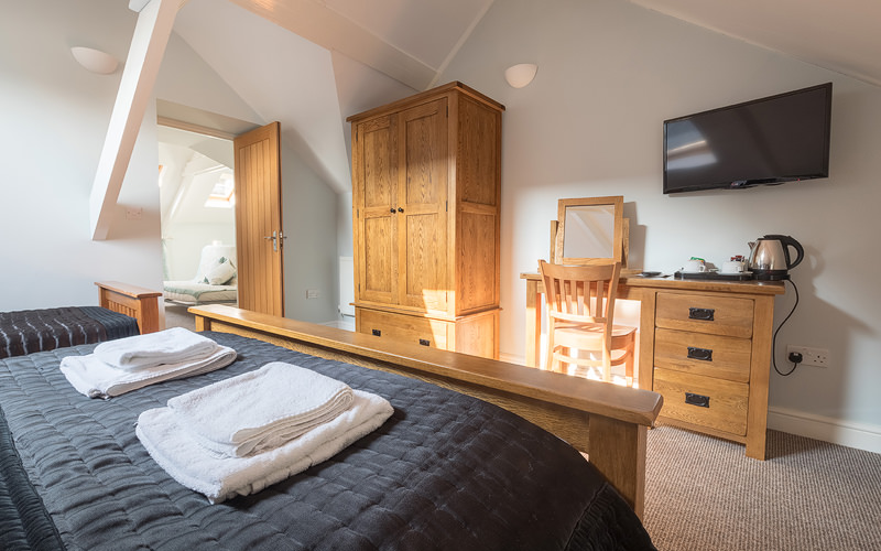 A king size double room with en-suite bath/shower room, hair dryer, free Wi-Fi access, lcd tv with freeview, toiletries and tea/coffee making facilities. This room is also available as a family room (triple) with an additional full size single bed, and room for a further infant cot or child’s bed, additional charges apply depending on total occupancy and age of children. Please send your enquiry by email.
